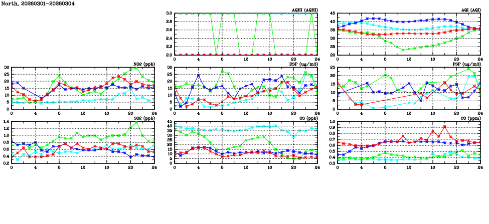 | Air Quality Data Time Series in North (2026/03/04) | ( Line colors: Day -3 Day -2 Day -1 Current day ) | 2D Map Current AQHI |