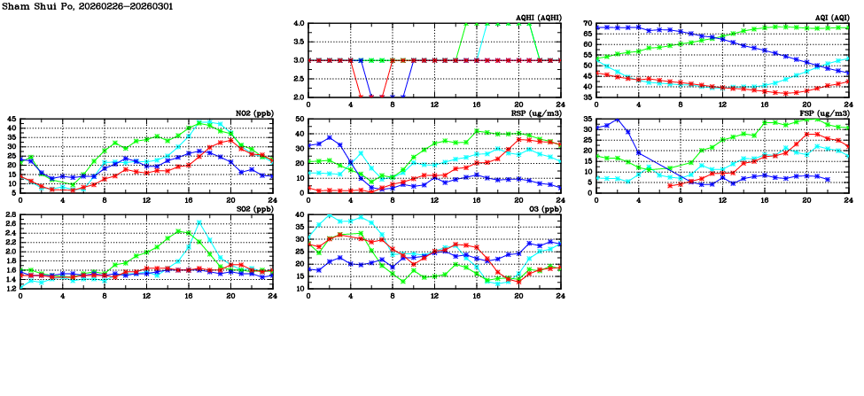 | Air Quality Data Time Series in Sham Shui Po (2026/03/01) | ( Line colors: Day -3 Day -2 Day -1 Current day ) | 2D Map Current AQHI |