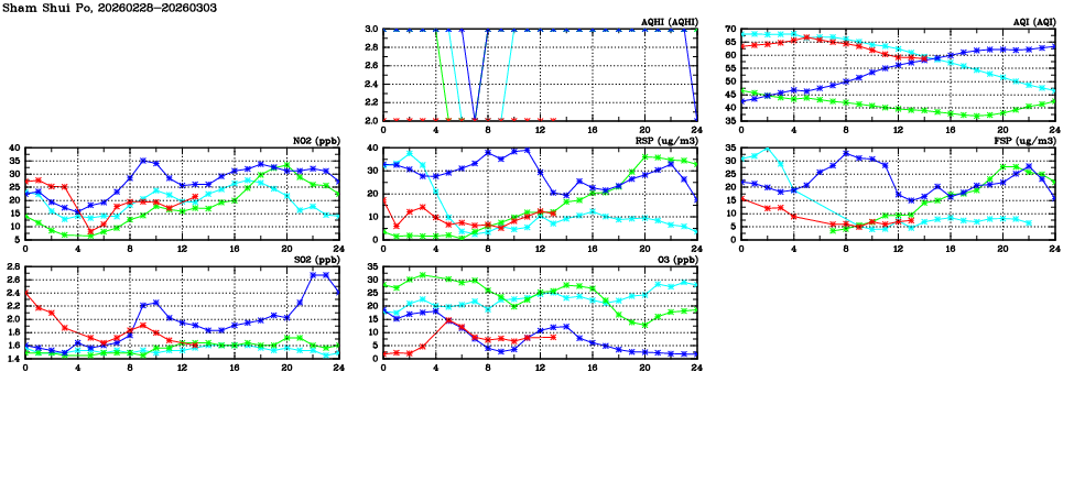 | Air Quality Data Time Series in Sham Shui Po (2026/03/03) | ( Line colors: Day -3 Day -2 Day -1 Current day ) | 2D Map Current AQHI |