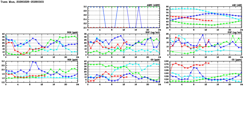 | Air Quality Data Time Series in Tuen Mun (2026/03/03) | ( Line colors: Day -3 Day -2 Day -1 Current day ) | 2D Map Current AQHI |
