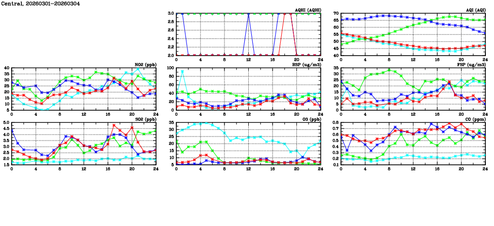 | Air Quality Data Time Series in Central (2026/03/04) | ( Line colors: Day -3 Day -2 Day -1 Current day ) | 2D Map Current AQHI |