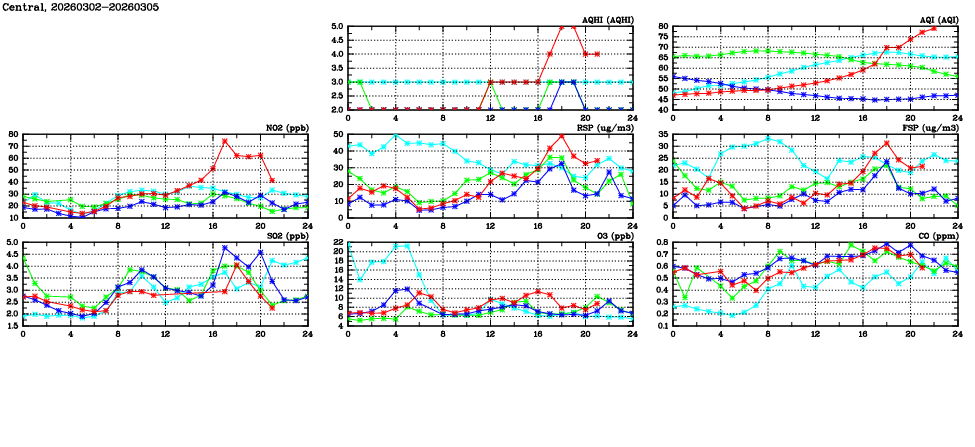 | Air Quality Data Time Series in Central (2026/03/05) | ( Line colors: Day -3 Day -2 Day -1 Current day ) | 2D Map Current AQHI |