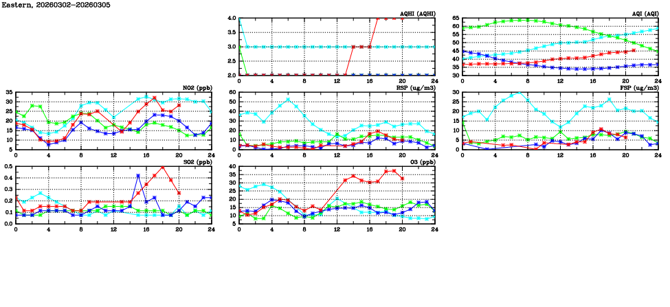 | Air Quality Data Time Series in Eastern (2026/03/05) | ( Line colors: Day -3 Day -2 Day -1 Current day ) | 2D Map Current AQHI |