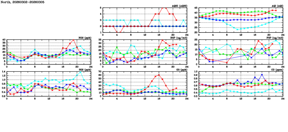 | Air Quality Data Time Series in North (2026/03/05) | ( Line colors: Day -3 Day -2 Day -1 Current day ) | 2D Map Current AQHI |