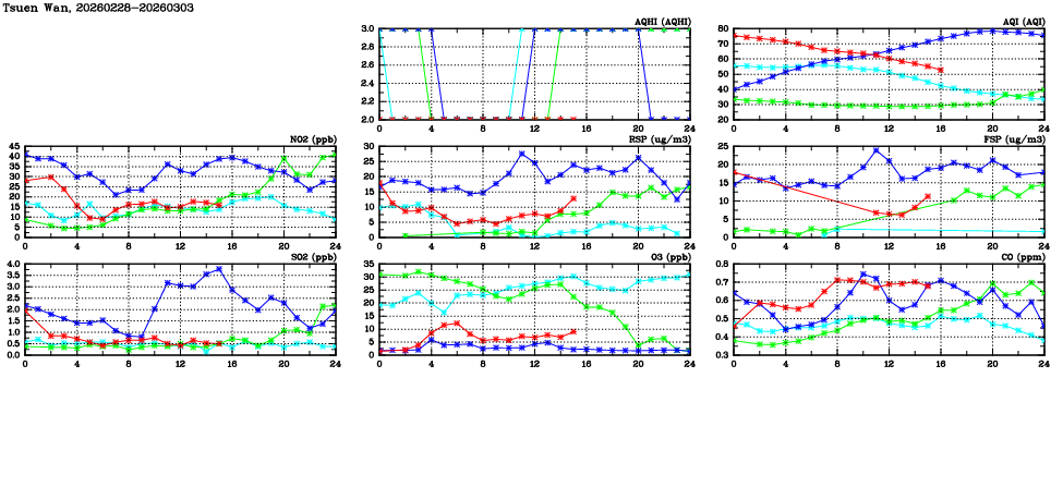 | Air Quality Data Time Series in Tsuen Wan (2026/03/03) | ( Line colors: Day -3 Day -2 Day -1 Current day ) | 2D Map Current AQHI |