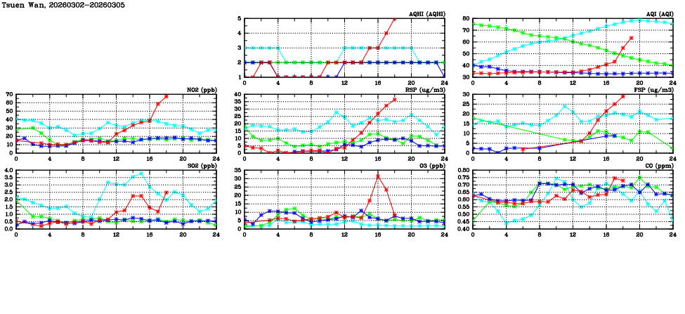 | Air Quality Data Time Series in Tsuen Wan (2026/03/05) | ( Line colors: Day -3 Day -2 Day -1 Current day ) | 2D Map Current AQHI |