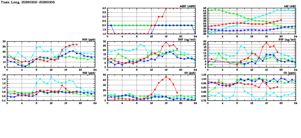 | Air Quality Data Time Series in Yuen Long (2026/03/05) | ( Line colors: Day -3 Day -2 Day -1 Current day ) | 2D Map Current AQHI |