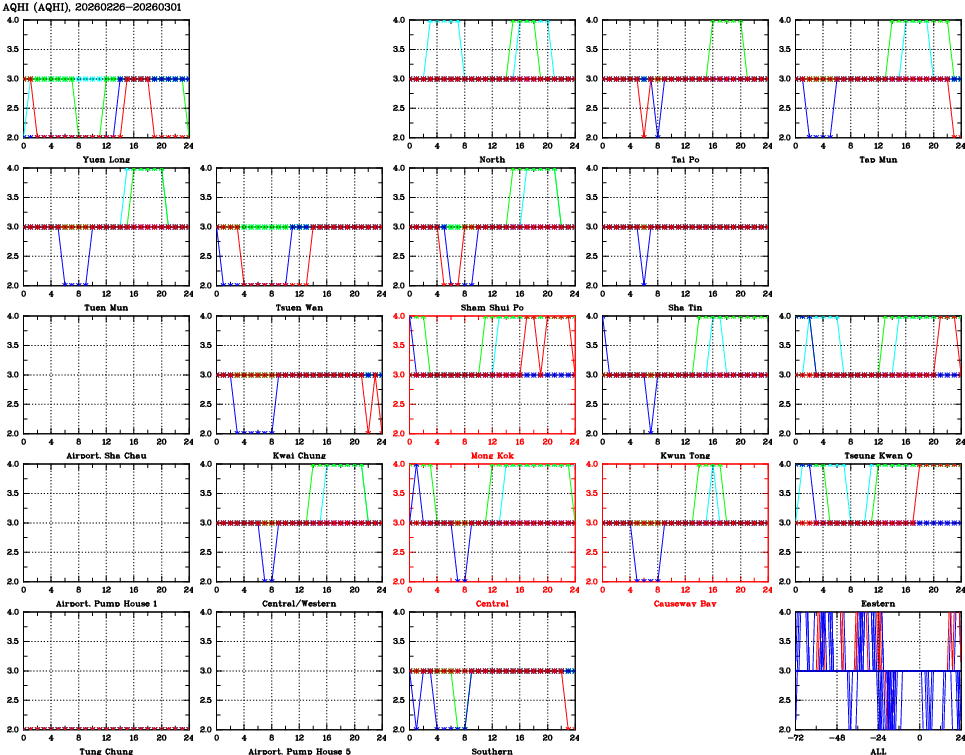 | Air Quality Data Time Series for AQHI (2026/03/01) | ( Line colors: Day -3 Day -2 Day -1 Current day ) | 2D Map Current AQHI |