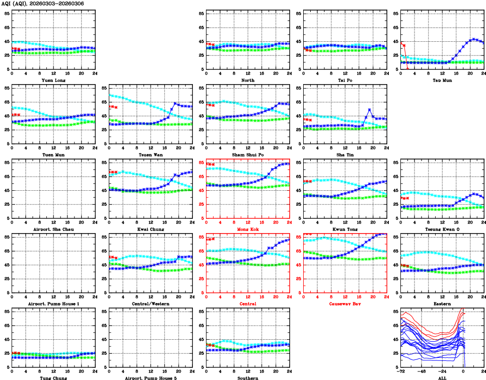| Air Quality Data Time Series for AQI (2026/03/06) | ( Line colors: Day -3 Day -2 Day -1 Current day ) | 2D Map Current AQHI |