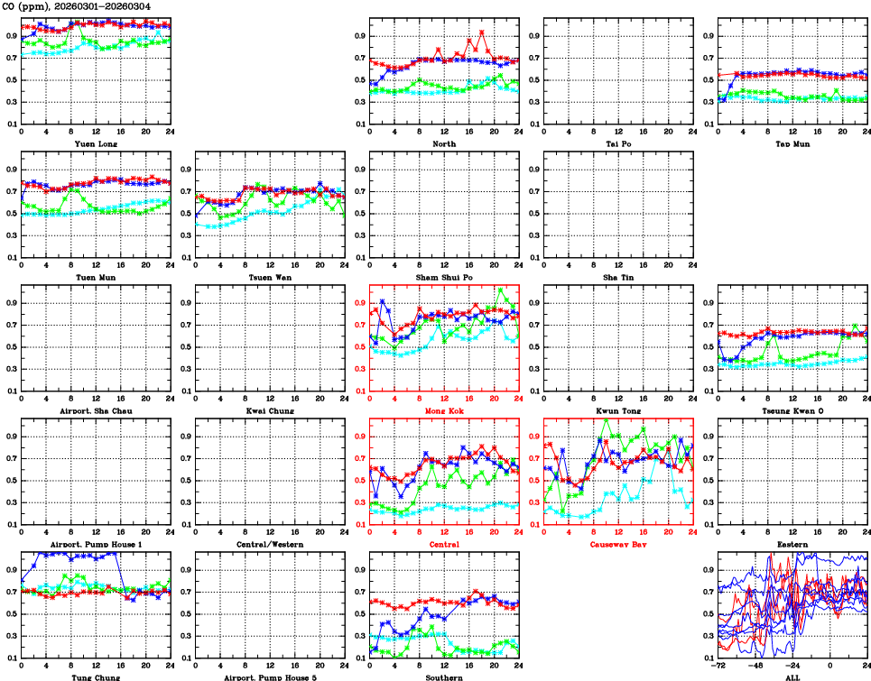 | Air Quality Data Time Series for CO (2026/03/04) | ( Line colors: Day -3 Day -2 Day -1 Current day ) | 2D Map Current AQHI |