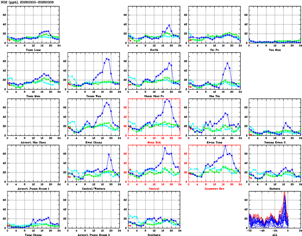 | Air Quality Data Time Series for NO2 (2026/03/06) | ( Line colors: Day -3 Day -2 Day -1 Current day ) | 2D Map Current AQHI |
