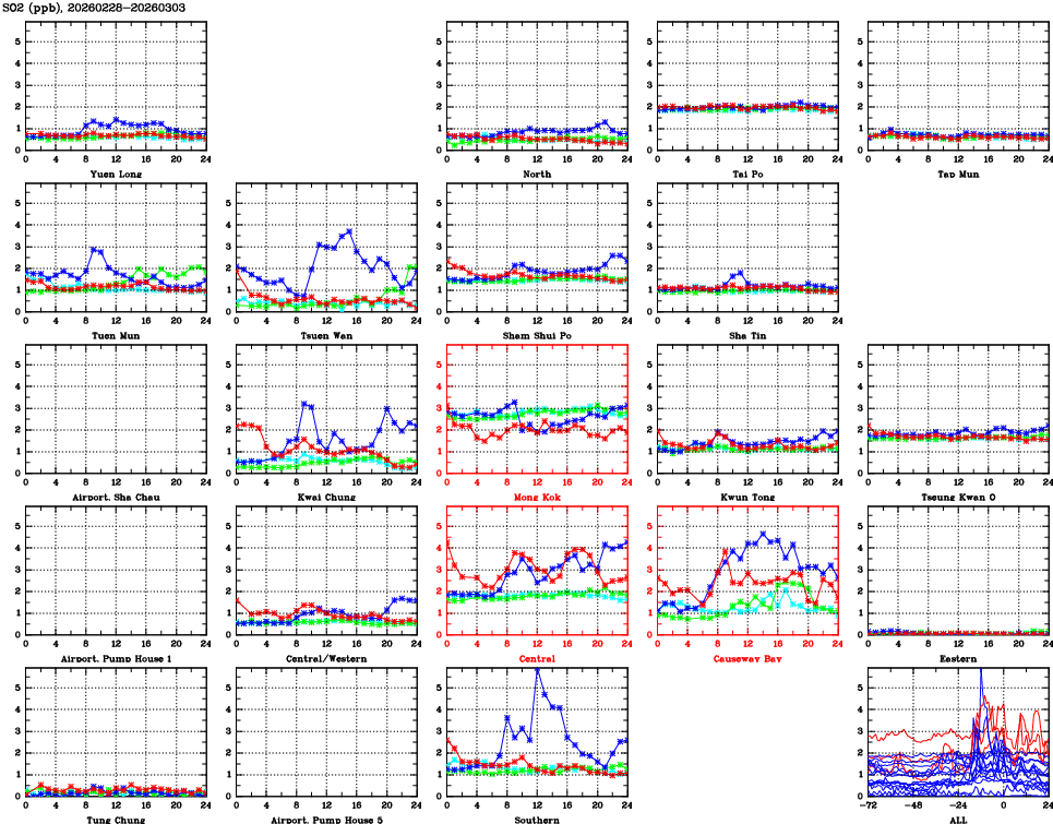 | Air Quality Data Time Series for SO2 (2026/03/03) | ( Line colors: Day -3 Day -2 Day -1 Current day ) | 2D Map Current AQHI |