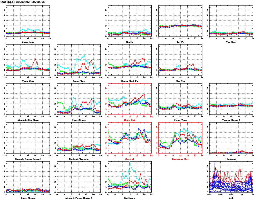 | Air Quality Data Time Series for SO2 (2026/03/05) | ( Line colors: Day -3 Day -2 Day -1 Current day ) | 2D Map Current AQHI |
