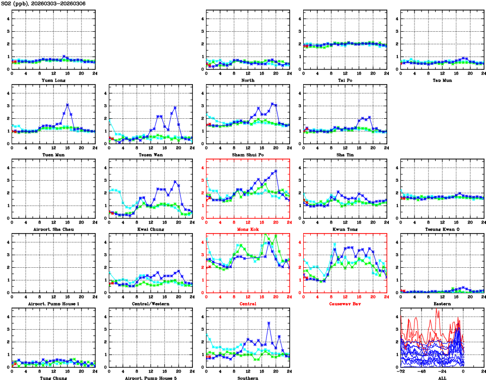| Air Quality Data Time Series for SO2 (2026/03/06) | ( Line colors: Day -3 Day -2 Day -1 Current day ) | 2D Map Current AQHI |
