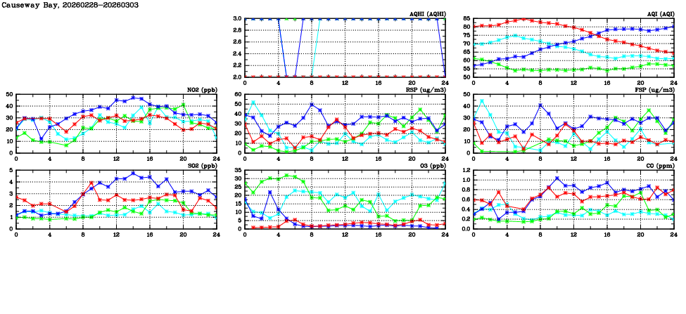 | Air Quality Data Time Series in Causeway Bay (2026/03/03) | ( Line colors: Day -3 Day -2 Day -1 Current day ) | 2D Map Current AQHI |
