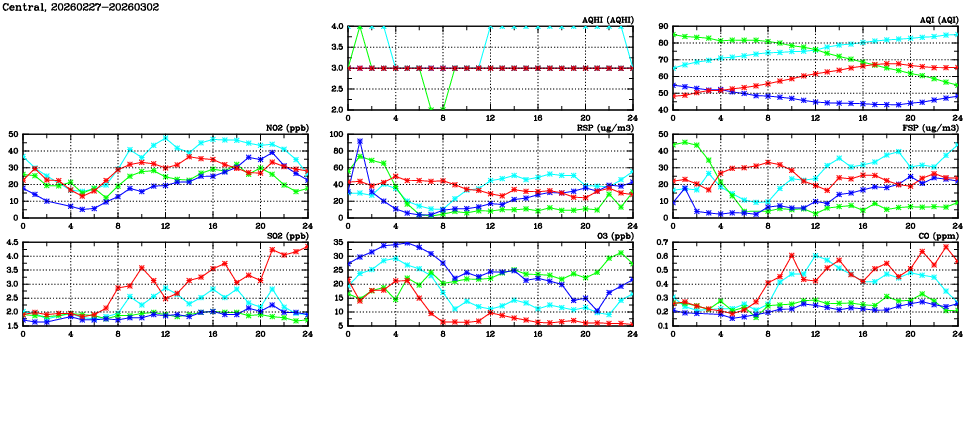 | Air Quality Data Time Series in Central (2026/03/02) | ( Line colors: Day -3 Day -2 Day -1 Current day ) | 2D Map Current AQHI |