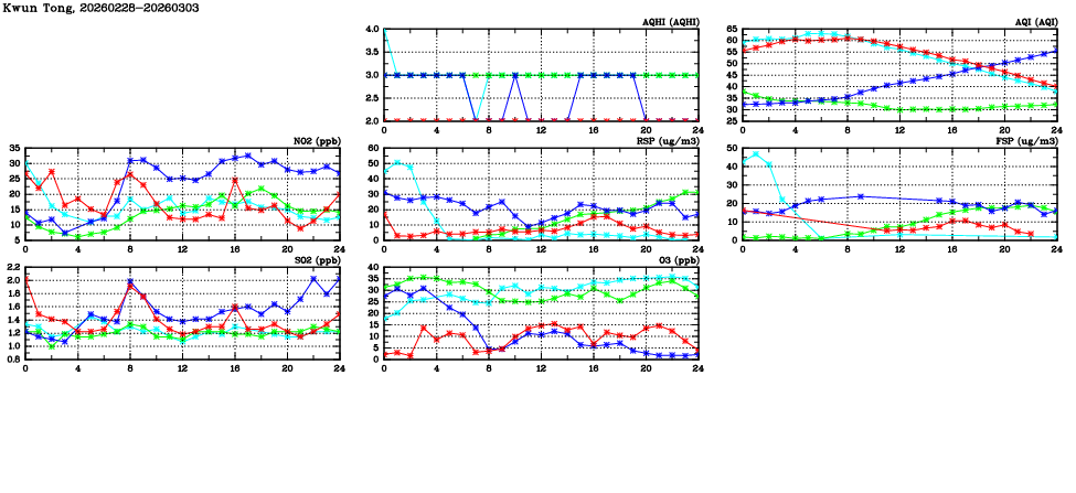 | Air Quality Data Time Series in Kwun Tong (2026/03/03) | ( Line colors: Day -3 Day -2 Day -1 Current day ) | 2D Map Current AQHI |