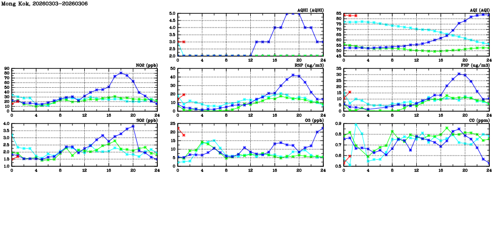 | Air Quality Data Time Series in Mong Kok (2026/03/06) | ( Line colors: Day -3 Day -2 Day -1 Current day ) | 2D Map Current AQHI |