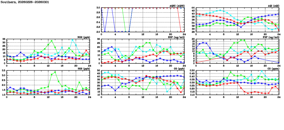 | Air Quality Data Time Series in Southern (2026/03/01) | ( Line colors: Day -3 Day -2 Day -1 Current day ) | 2D Map Current AQHI |