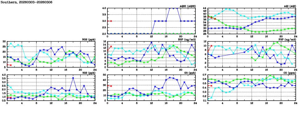| Air Quality Data Time Series in Southern (2026/03/06) | ( Line colors: Day -3 Day -2 Day -1 Current day ) | 2D Map Current AQHI |