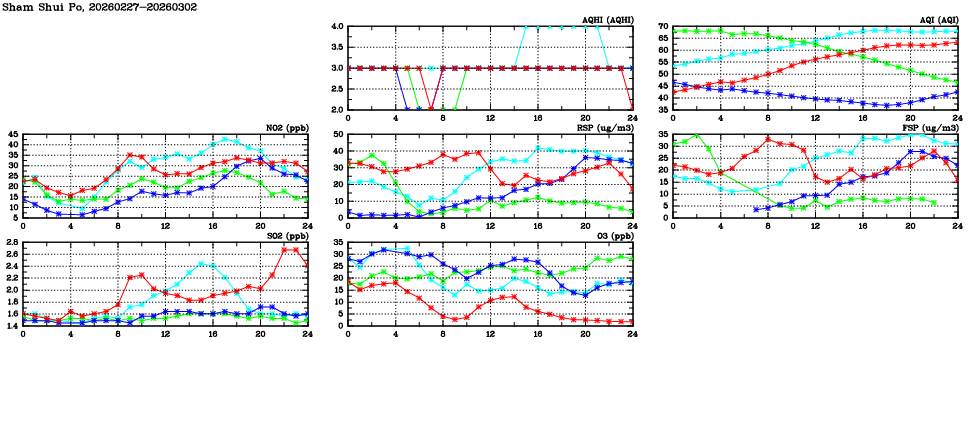 | Air Quality Data Time Series in Sham Shui Po (2026/03/02) | ( Line colors: Day -3 Day -2 Day -1 Current day ) | 2D Map Current AQHI |