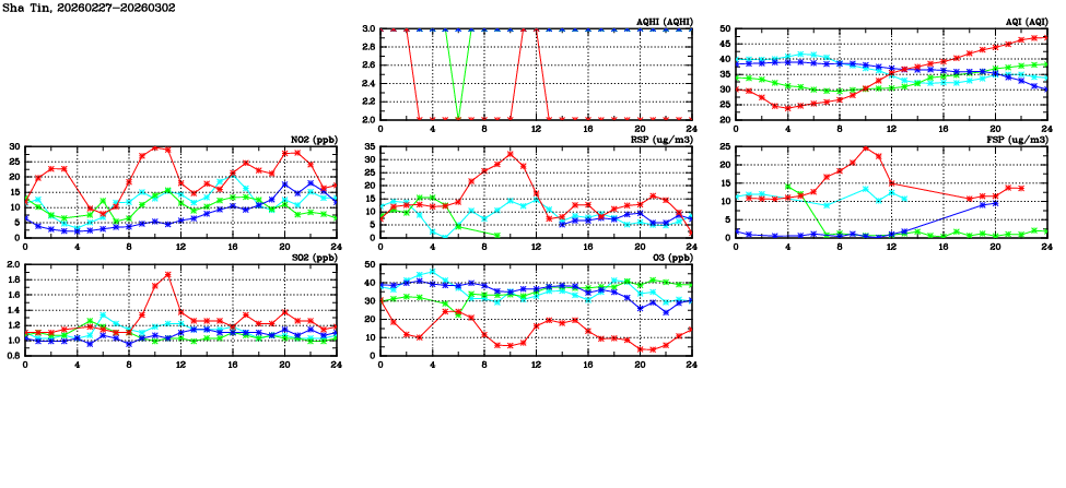 | Air Quality Data Time Series in Sha Tin (2026/03/02) | ( Line colors: Day -3 Day -2 Day -1 Current day ) | 2D Map Current AQHI |