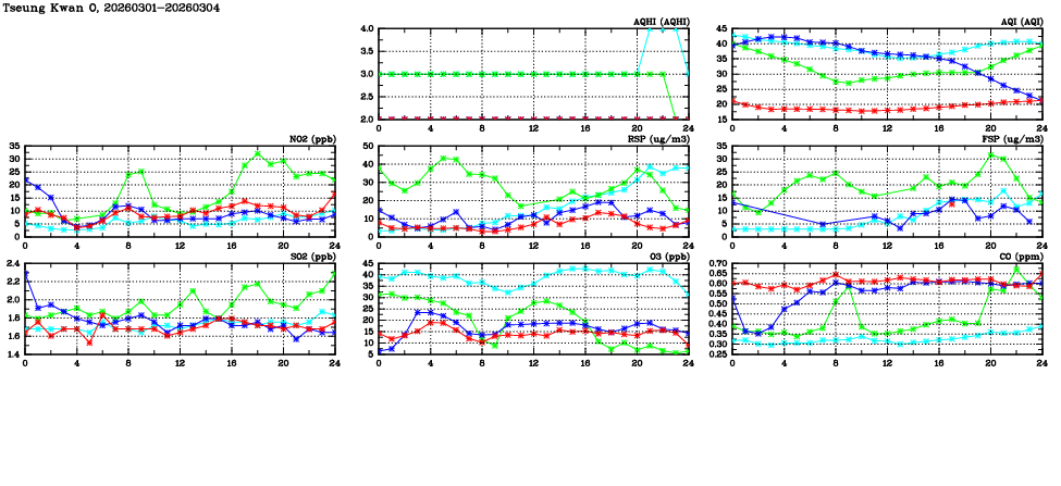 | Air Quality Data Time Series in Tseung Kwan O (2026/03/04) | ( Line colors: Day -3 Day -2 Day -1 Current day ) | 2D Map Current AQHI |