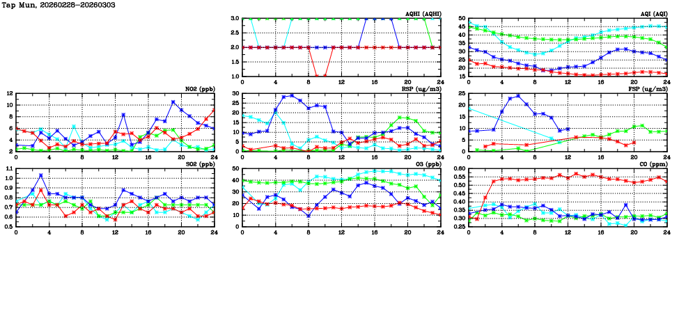 | Air Quality Data Time Series in Tap Mun (2026/03/03) | ( Line colors: Day -3 Day -2 Day -1 Current day ) | 2D Map Current AQHI |