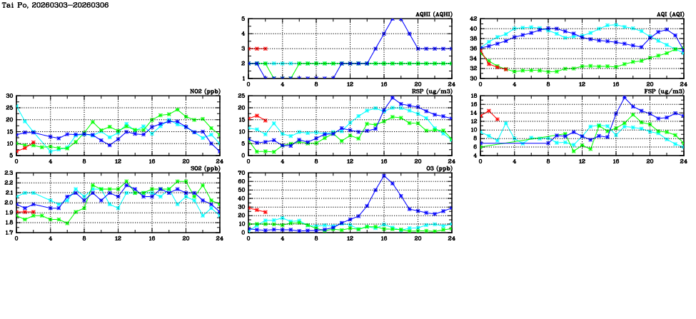| Air Quality Data Time Series in Tai Po (2026/03/06) | ( Line colors: Day -3 Day -2 Day -1 Current day ) | 2D Map Current AQHI |