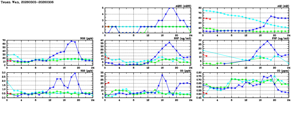 | Air Quality Data Time Series in Tsuen Wan (2026/03/06) | ( Line colors: Day -3 Day -2 Day -1 Current day ) | 2D Map Current AQHI |