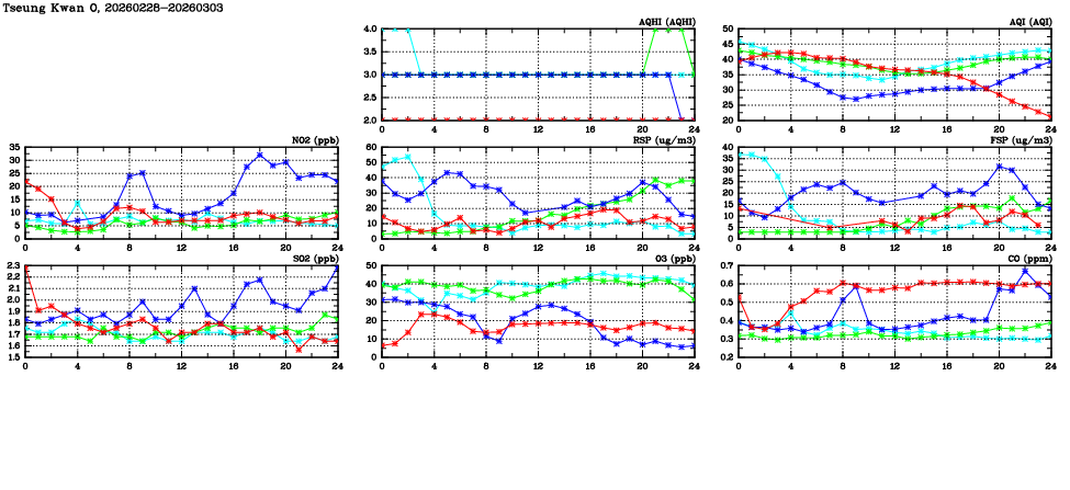 | Air Quality Data Time Series in Tseung Kwan O (2026/03/03) | ( Line colors: Day -3 Day -2 Day -1 Current day ) | 2D Map Current AQHI |