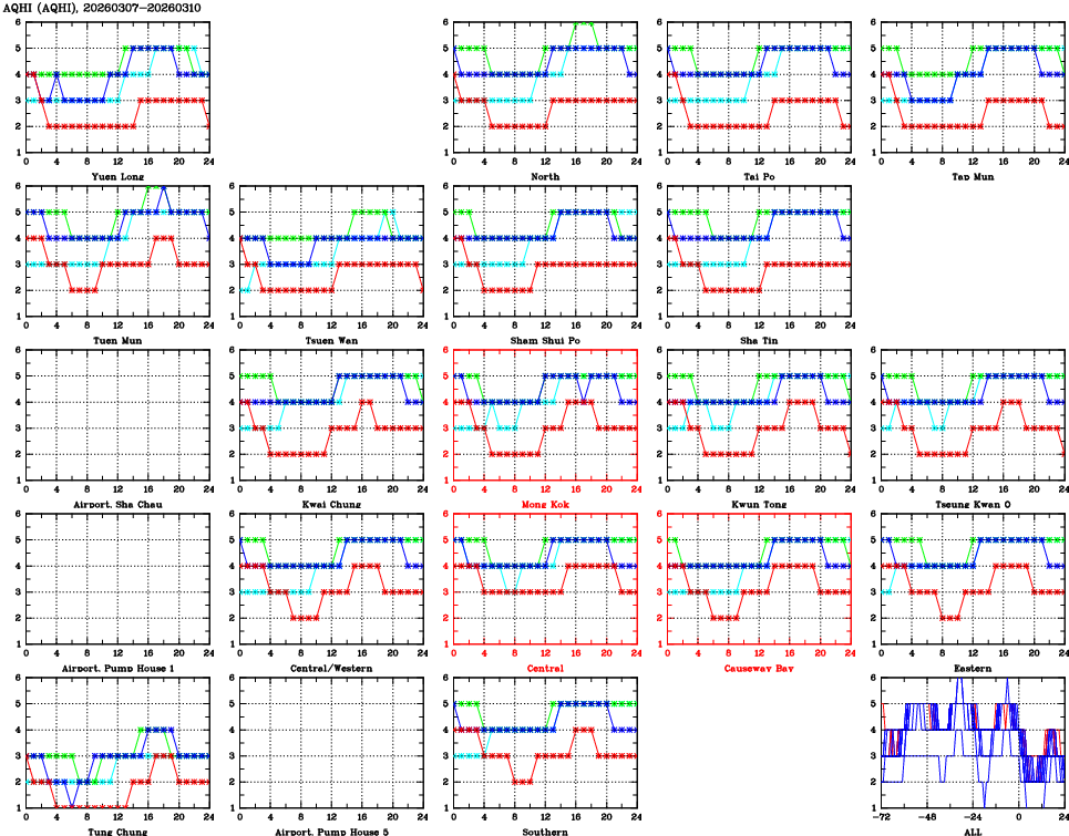 | Air Quality Data Time Series for AQHI (2026/03/10) | ( Line colors: Day -3 Day -2 Day -1 Current day ) | 2D Map Current AQHI |