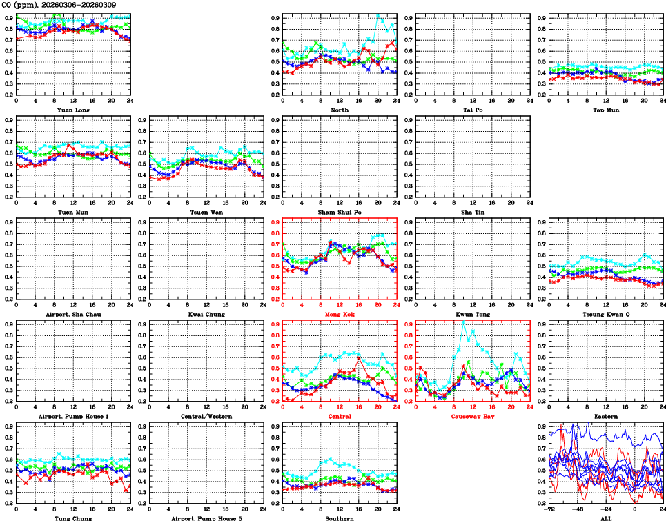 | Air Quality Data Time Series for CO (2026/03/09) | ( Line colors: Day -3 Day -2 Day -1 Current day ) | 2D Map Current AQHI |
