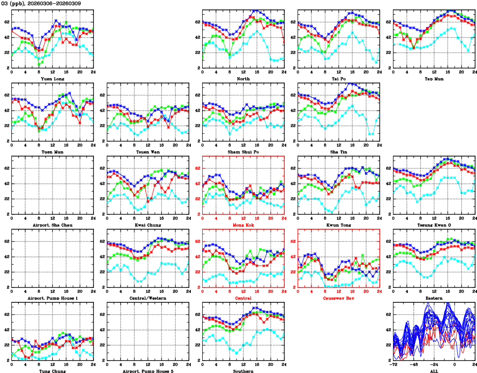 | Air Quality Data Time Series for O3 (2026/03/09) | ( Line colors: Day -3 Day -2 Day -1 Current day ) | 2D Map Current AQHI |