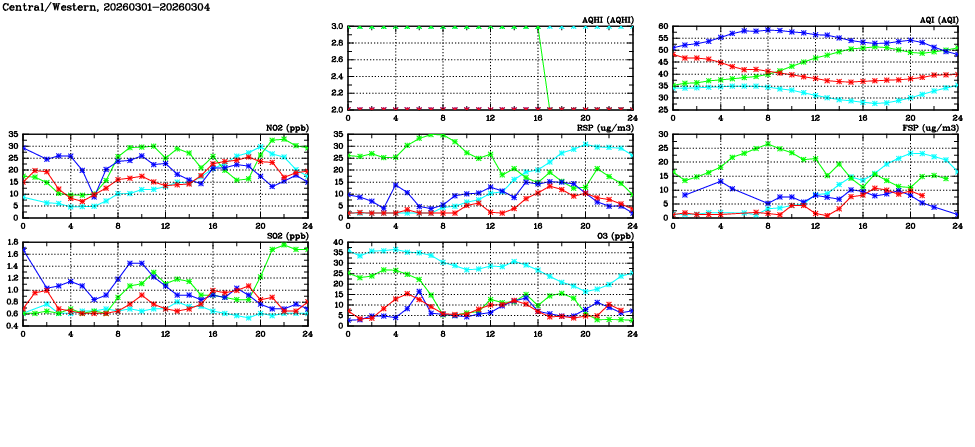 | Air Quality Data Time Series in Central/Western (2026/03/04) | ( Line colors: Day -3 Day -2 Day -1 Current day ) | 2D Map Current AQHI |