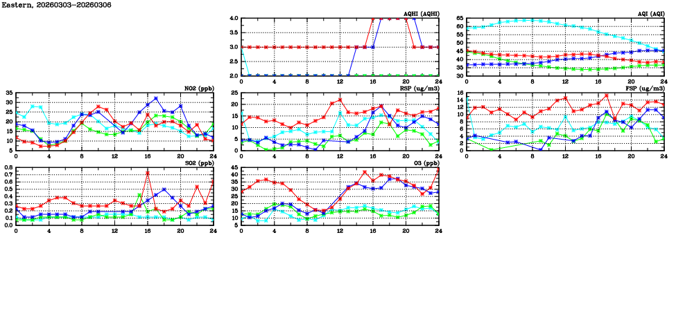 | Air Quality Data Time Series in Eastern (2026/03/06) | ( Line colors: Day -3 Day -2 Day -1 Current day ) | 2D Map Current AQHI |