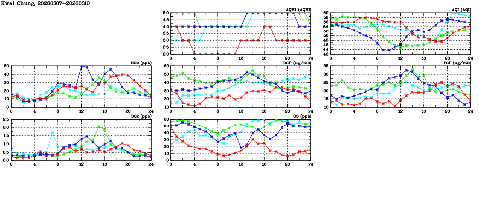 | Air Quality Data Time Series in Kwai Chung (2026/03/10) | ( Line colors: Day -3 Day -2 Day -1 Current day ) | 2D Map Current AQHI |