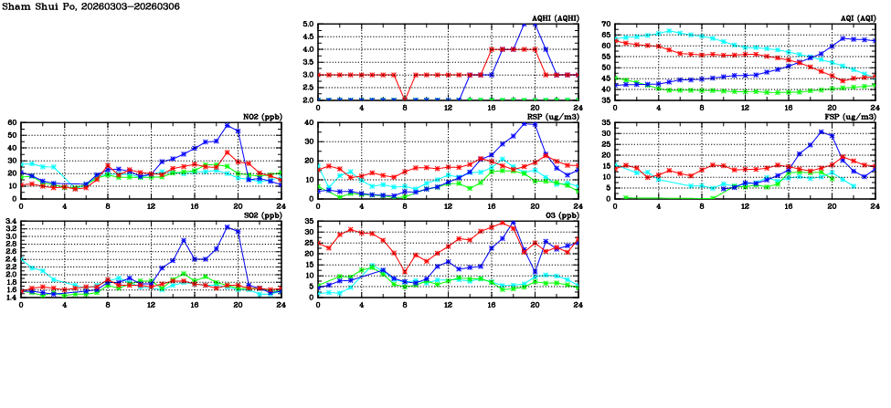 | Air Quality Data Time Series in Sham Shui Po (2026/03/06) | ( Line colors: Day -3 Day -2 Day -1 Current day ) | 2D Map Current AQHI |