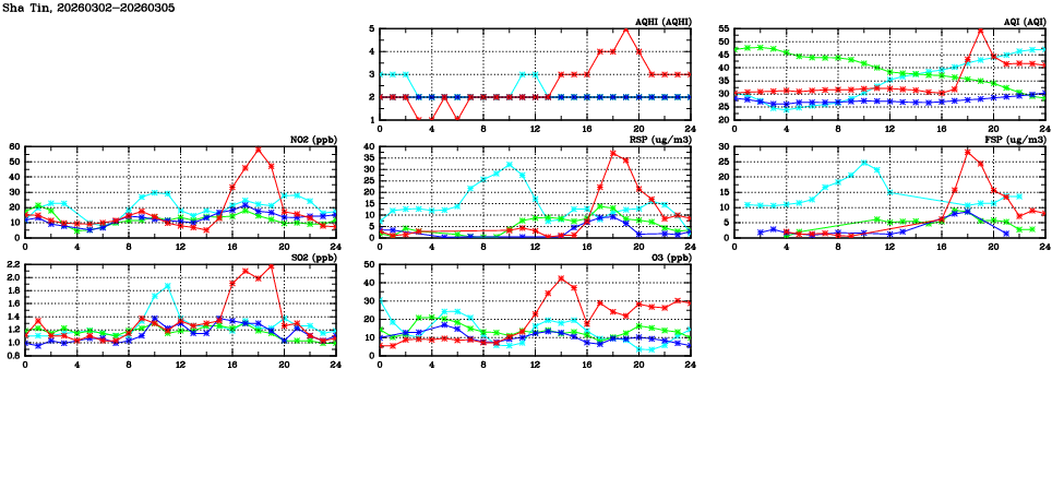 | Air Quality Data Time Series in Sha Tin (2026/03/05) | ( Line colors: Day -3 Day -2 Day -1 Current day ) | 2D Map Current AQHI |