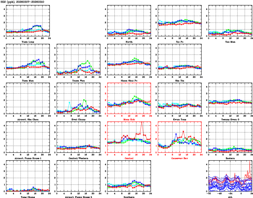| Air Quality Data Time Series for SO2 (2026/03/10) | ( Line colors: Day -3 Day -2 Day -1 Current day ) | 2D Map Current AQHI |