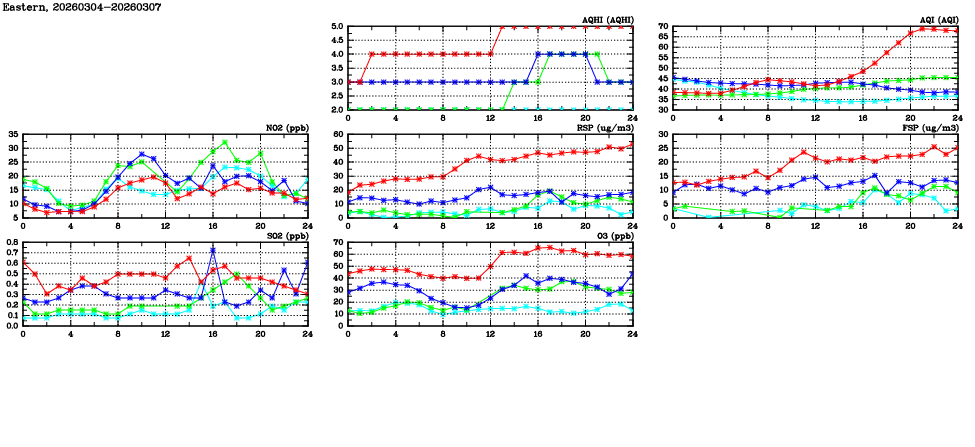 | Air Quality Data Time Series in Eastern (2026/03/07) | ( Line colors: Day -3 Day -2 Day -1 Current day ) | 2D Map Current AQHI |