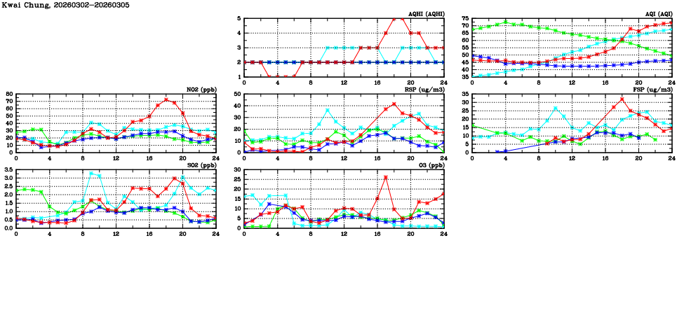 | Air Quality Data Time Series in Kwai Chung (2026/03/05) | ( Line colors: Day -3 Day -2 Day -1 Current day ) | 2D Map Current AQHI |