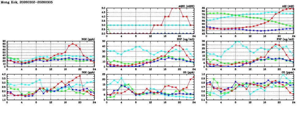 | Air Quality Data Time Series in Mong Kok (2026/03/05) | ( Line colors: Day -3 Day -2 Day -1 Current day ) | 2D Map Current AQHI |