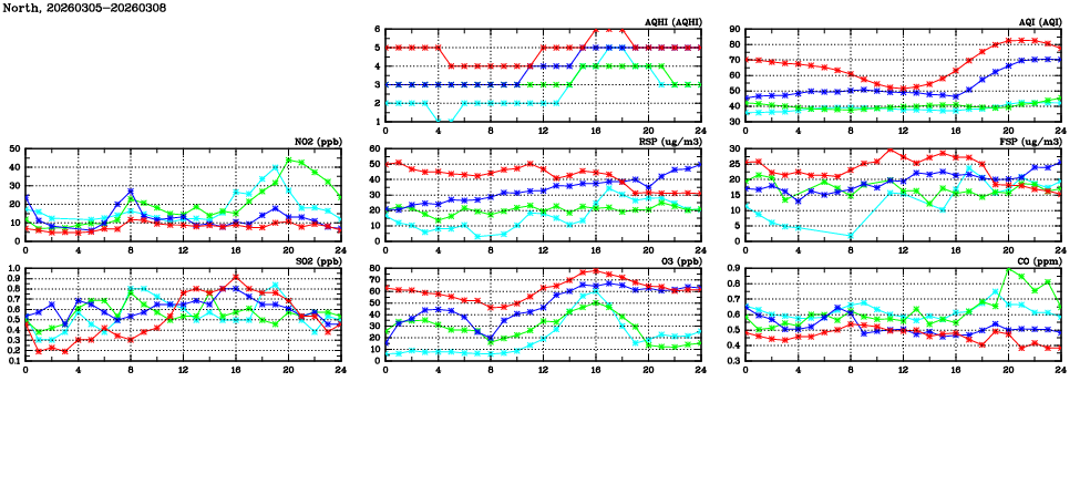 | Air Quality Data Time Series in North (2026/03/08) | ( Line colors: Day -3 Day -2 Day -1 Current day ) | 2D Map Current AQHI |