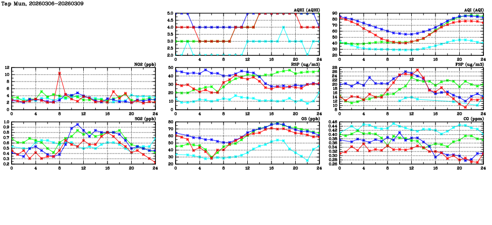 | Air Quality Data Time Series in Tap Mun (2026/03/09) | ( Line colors: Day -3 Day -2 Day -1 Current day ) | 2D Map Current AQHI |