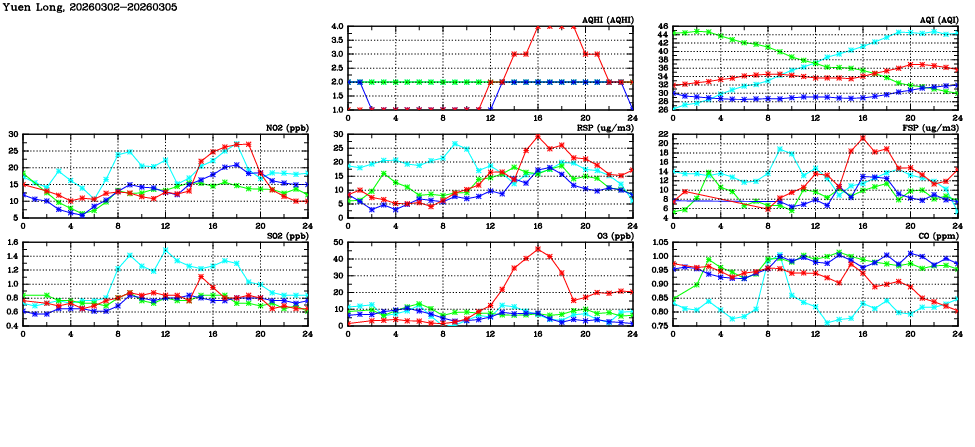 | Air Quality Data Time Series in Yuen Long (2026/03/05) | ( Line colors: Day -3 Day -2 Day -1 Current day ) | 2D Map Current AQHI |