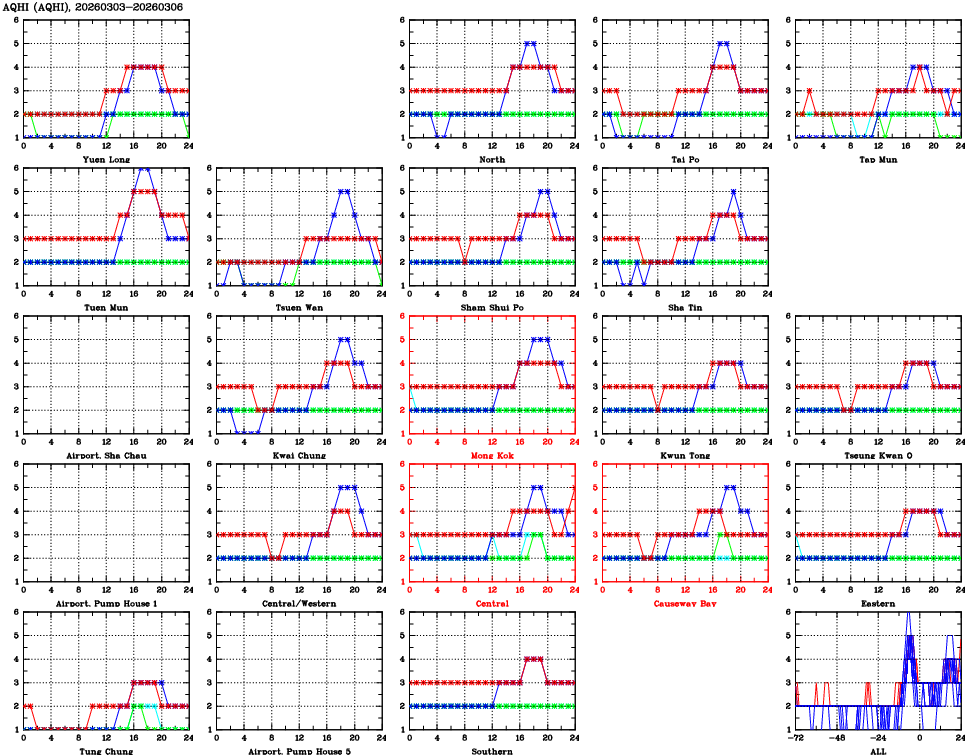 | Air Quality Data Time Series for AQHI (2026/03/06) | ( Line colors: Day -3 Day -2 Day -1 Current day ) | 2D Map Current AQHI |