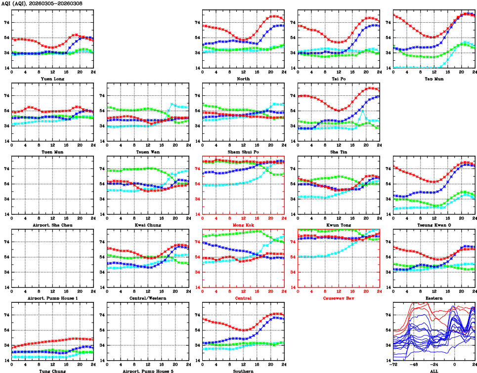 | Air Quality Data Time Series for AQI (2026/03/08) | ( Line colors: Day -3 Day -2 Day -1 Current day ) | 2D Map Current AQHI |