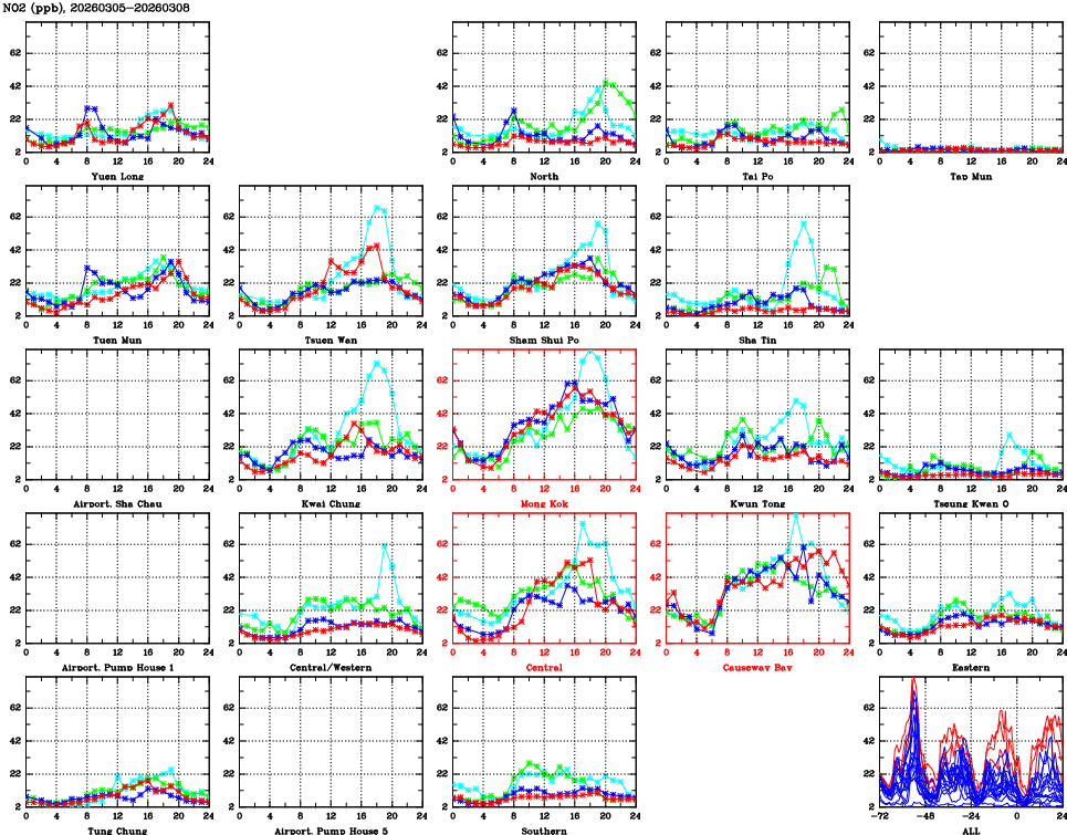 | Air Quality Data Time Series for NO2 (2026/03/08) | ( Line colors: Day -3 Day -2 Day -1 Current day ) | 2D Map Current AQHI |