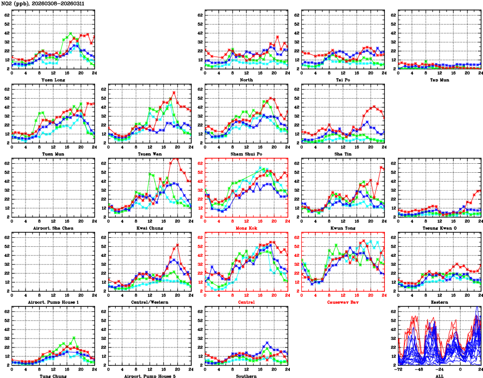 | Air Quality Data Time Series for NO2 (2026/03/11) | ( Line colors: Day -3 Day -2 Day -1 Current day ) | 2D Map Current AQHI |